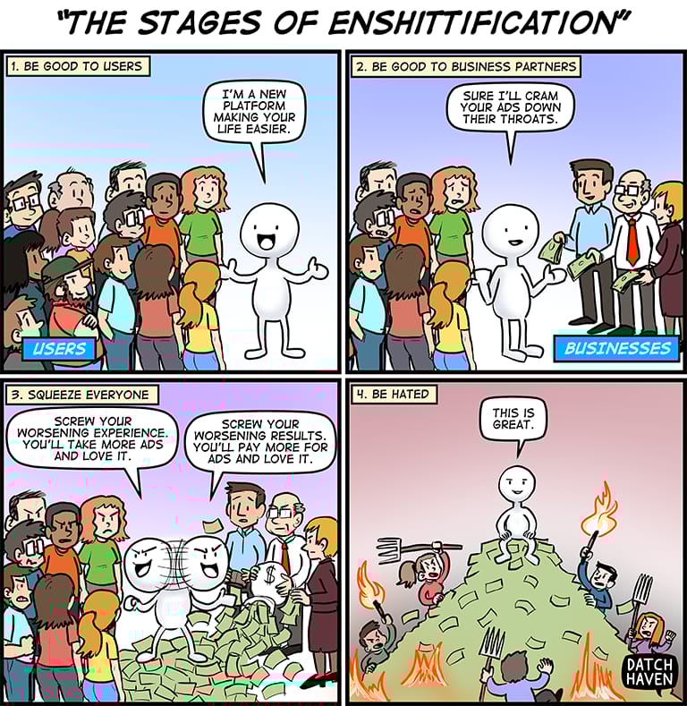 If you are unaware, enshittification is the process in which companies get worse and worse. First, the company is good for the users. Then, they abuse the users to be good for their business partners. Finally, they abuse users and business partners to be good to themselves and their shareholders. Think of the declining quality of everything: Google search, Facebook, YouTube, and so on.
